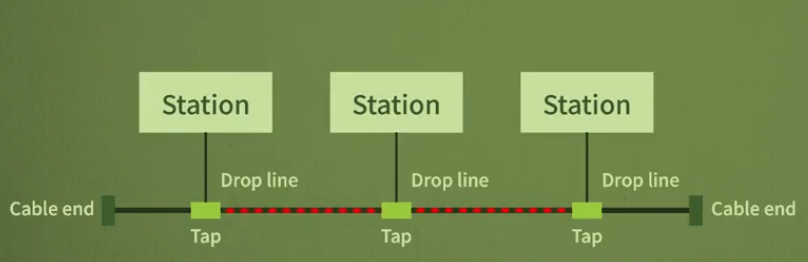 - 하나의 케이블에 여러 장치들이 연결되어 각 신호가 전체에 전달되는 형태